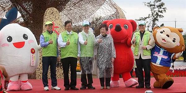 開幕式中農委會主委林聰賢(右起)、前副總統呂秀蓮、副總統陳建仁、桃園市長鄭文燦及環保署長李應元邀請民眾前來參觀。(范揚光攝)