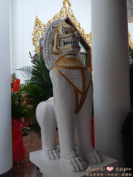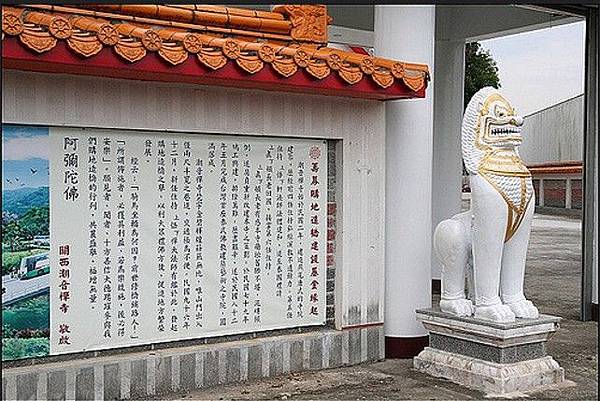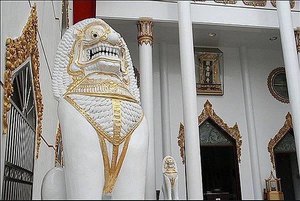 儘管天獅威儀堂堂,但是露出白牙的笑臉卻予人親善的感受,該寺廟護法會總幹事鍾金明說,這代表佛法慈祥、歡迎十方信眾。
