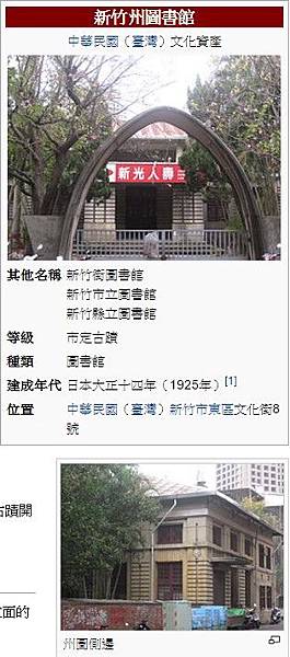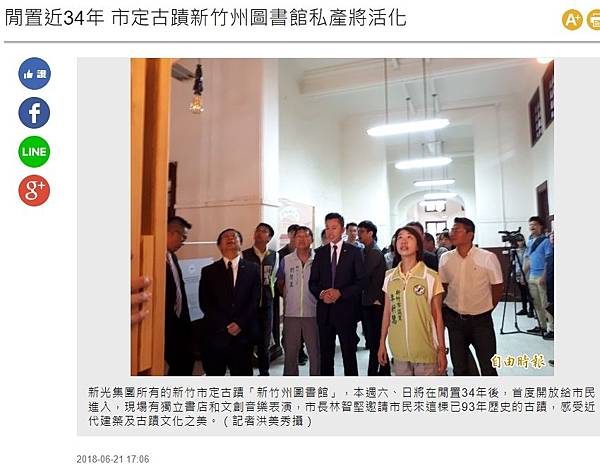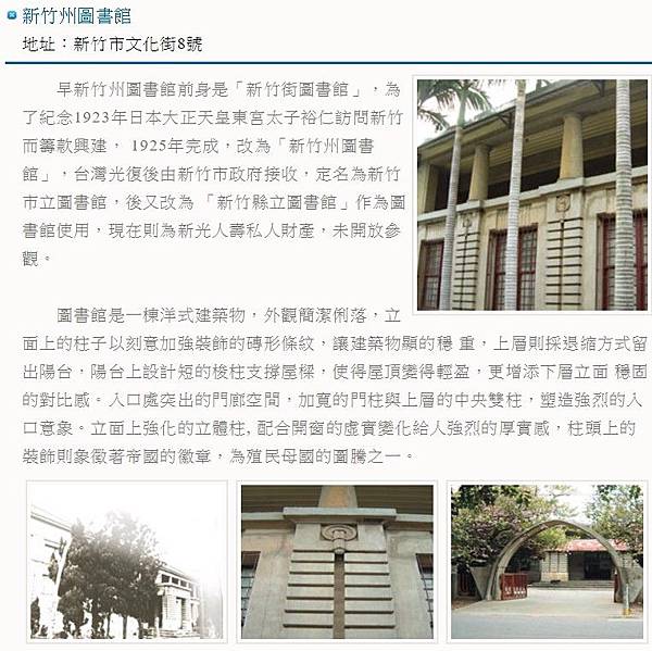 中央社30日報導,有91年歷史的「新竹州圖書館」,建物採用「近代復興式樣」風格,兼具古典與現代建築元素,為台灣近代建築史代表作,在新竹縣市未分家時,由縣府賣給新光人壽,縣市分家後,民國87年被新竹市政府指定為市定古蹟。