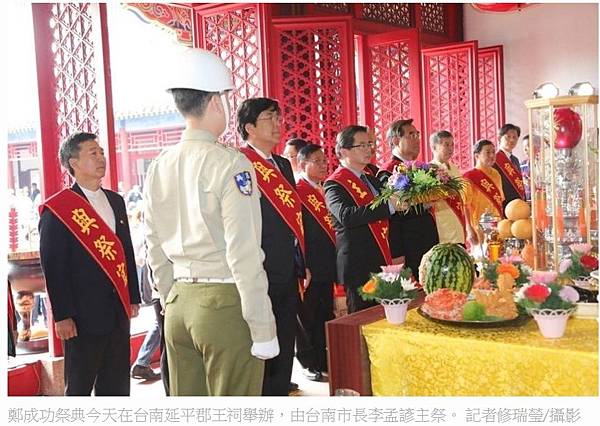 台南市政府從民國35年起,每年由官方舉辦延平郡王祭典,52年起行政院更改為中樞祭典,由內政部長擔任主祭,一直到去年內政部表示為落實地方自治,未來將由地方首長擔任主祭,內政部長打破54年的慣例未南下,改由當時的台南市長賴清德主祭。