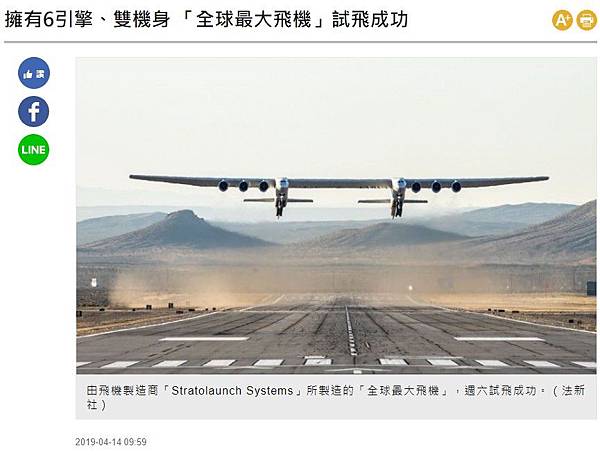 分享擁有6引擎、雙機身 「全球最大飛機」試飛成功到Facebook 分享擁有6引擎、雙機身 「全球最大飛機」試飛成功到Line