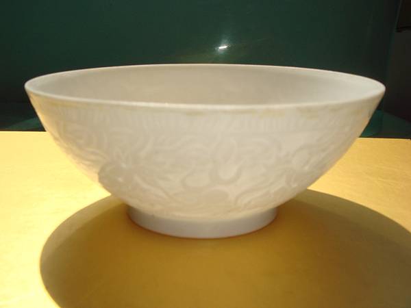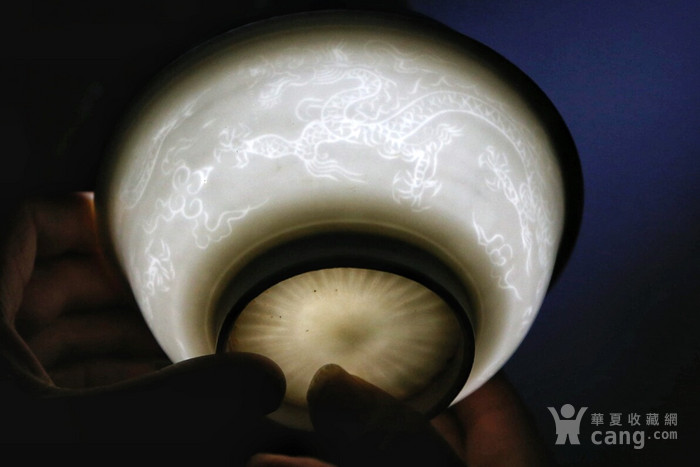 白釉薄胎釉質肥厚瑩潤,乾淨透明,多數以暗刻為主。其實明刻,暗刻也沒啥區別,所不用的只是在白素胎上刻劃紋飾,然後又罩上一層白釉。白胎和白釉,刻劃上的紋飾看上去就不明顯必須透過光源。如果施上彩釉,當然無需借助光源。