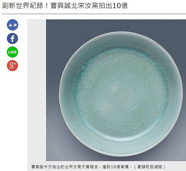 分享刷新世界紀錄!曹興誠北宋汝窯拍出10億到Facebook 分享刷新世界紀錄!曹興誠北宋汝窯拍出10億到Line 分享刷新世界紀錄!曹興誠北宋汝窯拍出10億到Google+