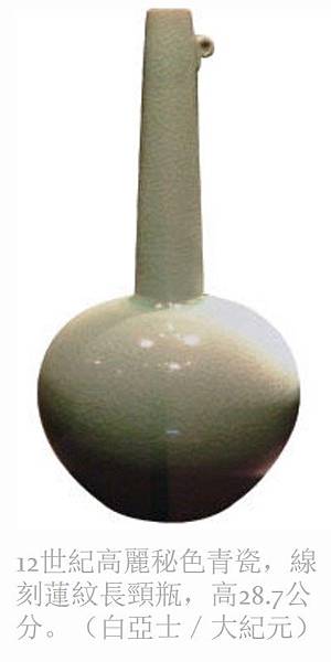 12世紀高麗秘色青瓷,線刻蓮紋長頸瓶,高28.7公分。(白亞士/大紀元)