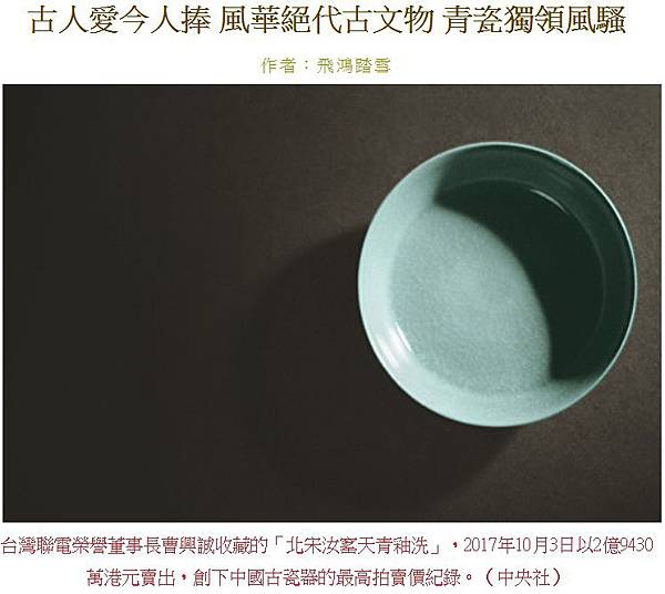 台灣聯電榮譽董事長曹興誠收藏的「北宋汝窰天青釉洗」,2017年10月3日以2億9430萬港元賣出,創下中國古瓷器的最高拍賣價紀錄。(中央社)