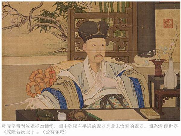 乾隆皇帝對汝瓷極為鍾愛,圖中乾隆左手邊的瓷器是北宋汝窯的瓷器。圖為清 朗世寧《乾隆著漢服 》。(公有領域)