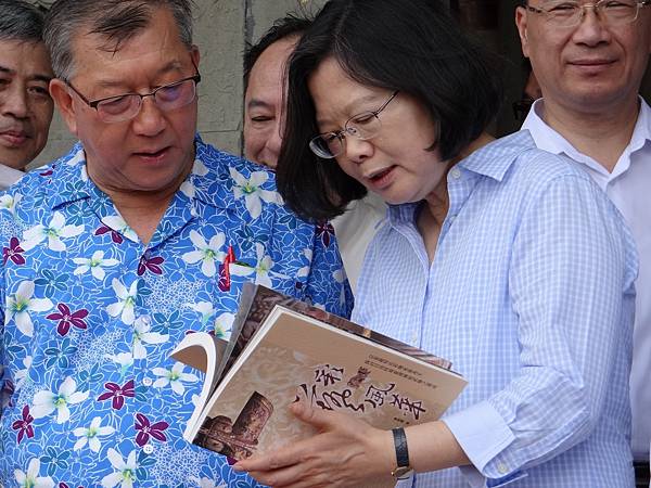 蔡英文今天上午出席新埔鎮的義民祭典之後,隨即轉往北埔鄉,在新竹縣長邱鏡淳、前縣長林光華、客委會主委李永得等人陪同下,參觀仍在修復中的姜氏家廟,由中原大學建築系教授薛琴說明各項修復工作,彩繪、瓦作、剪黏泥塑、泥作及石作等匠師,逐一向總統解說傳統施工技法,蔡英文仔細聆聽並提問。