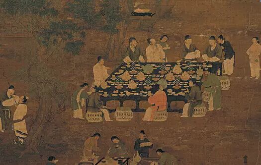 宋徽宗《文會圖》,茶几上備茶的茶盞是青黑色的。(飛鴻踏雪/大紀元)