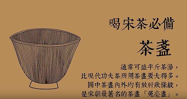 《大觀茶論》這麼說:「底必差深而微寬,底深則茶宜立而易於取乳,寬則運筅旋徹不礙擊拂……盞惟熱則茶發立耐久。」這其中點出了適合於點茶的好茶盞的要點:一是茶盞要深而微寬,才不會在運轉茶筅擊拂茶花時礙手礙腳的,或是讓茶花旋出茶盞外,才能讓茶花(茶乳)發立;二是茶盞蓄熱性良好的話,可以讓茶花發立耐久不散。