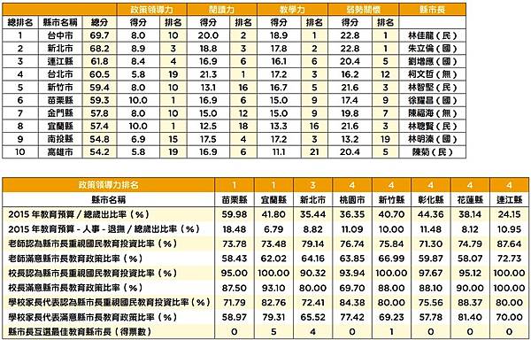 調查前10名,六都只有四都入榜。資源最豐沛的台北市在此次調查退居第四名,其中,「政府投入與領導者滿意度」排名十九,其中校長對市府的教育政策滿意度,不但是歷次調查最低,也是全國最低。反而是窮縣連江,進到前三名,因為連江縣連續三年國英數會考C的比例大幅下降,減C成效顯著。而宜蘭縣首度打敗台北市,成為縣市互選「最佳教育縣市長」第一名。