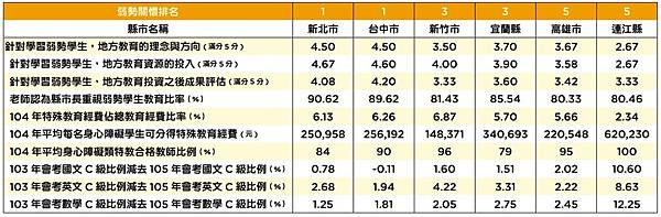 宜蘭縣首度打敗台北市,成為縣市互選「最佳教育縣市長」第一名。總成績第八名的宜蘭,此次在「弱勢關懷」項目中也取得第三名。國中教育會考實施以來,宜蘭每一年都試圖降低縣內5C及3C的學生。第六名的苗栗在「會考減C」成效顯著,103-105年國英數會考成績C的比例都減少2%以上,數學C更減少了4.6%。