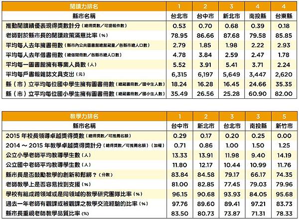 每兩年進行一次的縣市教育力大調查,從「政府投入與領導者滿意度」、「閱讀力」、「教學力」、「弱勢關懷」等四大面向、36個指標,針對全台22個縣市政府、校長及家長代表進行調查,回收1萬1157份有效問卷。