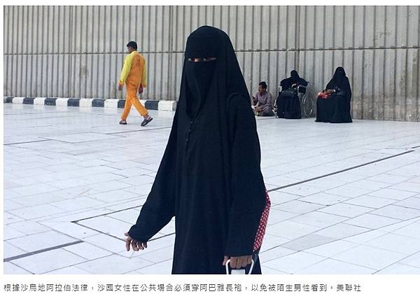根據沙烏地阿拉伯法律,沙國女性在公共場合必須穿阿巴雅長袍,以免被陌生男性看到。美聯社