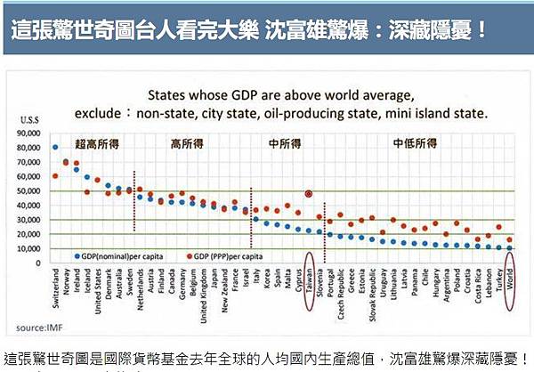 這張驚世奇圖是國際貨幣基金(IMF)去年全球的人均國內生產總值,顯示在人均GDP,台灣與塞浦路斯為鄰,但台灣以購買力平價計算的人均GDP,竟僅次於瑞典、德國。多數台灣人看了應十分欣慰,前民進黨立委沈富雄卻驚爆,其實深藏隱憂!