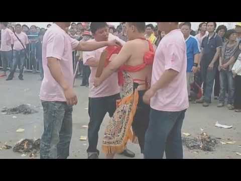 還是裝,不過那些兵刃可全是真的,這上頭作不了假,不然一下就會被拆穿的。只是在往自己身上捶打時,絕不可蠻幹,暗中只好施以巧力,舉得高,打得輕,這完全靠經驗和熟能生巧的手法,尤其像流星錘、鋼鍊那類軟的兵刃,往往是高高甩下,擊中身體的剎那,把手往後略略一揚,可以減輕力道,在連續的動作之下,不太容易看出破綻,不過皮肉受苦流血可是免不了的,所以需要有人在背後不停噴米酒,多少有點麻醉作用,可以減輕一點痛楚,但最重要的卻是「心理」問題;大庭廣眾之下,各方的乩童雲集,再痛也只好咬著牙硬撐,所謂「輸入不輸陣」是也,要喊痛敷藥只好等迎神賽會散了,回家關起門再說吧!