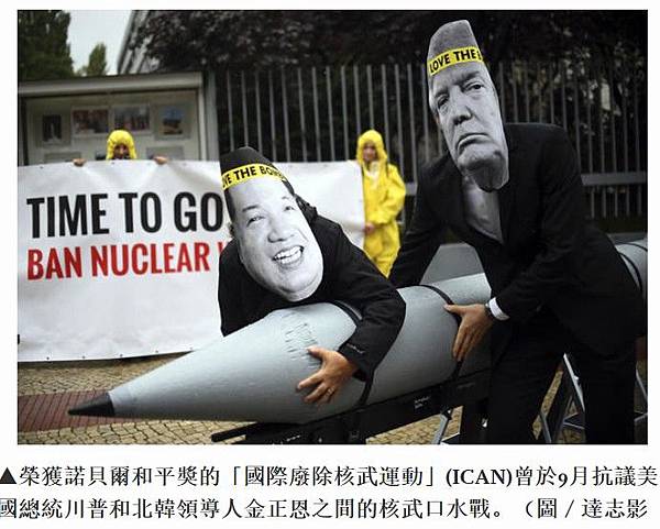 ▲榮獲諾貝爾和平獎的「國際廢除核武運動」(ICAN)曾於9月抗議美國總統川普和北韓領導人金正恩之間的核武口水戰。(圖/達志影像/美聯社)