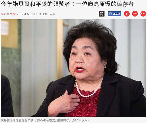 今年諾貝爾和平獎的領獎者:一位廣島原爆的倖存者