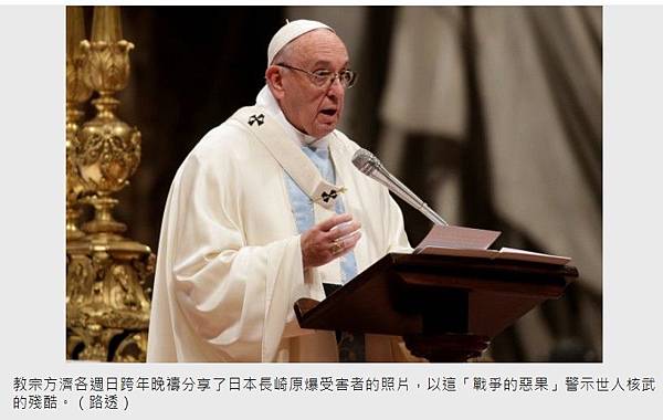 教宗方濟各週日跨年晚禱分享了日本長崎原爆受害者的照片,以這「戰爭的惡果」警示世人核武的殘酷。(路透)