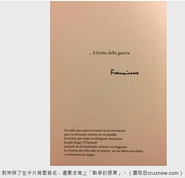 教宗除了在卡片背面簽名,還要求寫上「戰爭的惡果」。(圖取自cruxnow.com)