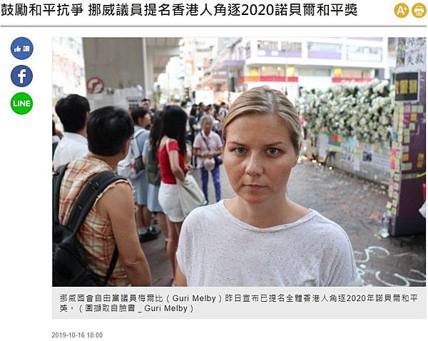 〔即時新聞/綜合報導〕早在6月中,便有外國媒體記者稱讚香港人和平示威的表現,表示「應得諾貝爾和平獎提名」。挪威國會自由黨議員梅爾比(Guri Melby)昨日宣布已提名全體香港人角逐2020年諾貝爾和平獎,希望可以藉此鼓勵港人繼續以「非暴力方式」進行抗爭。