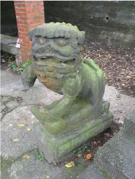 胸前牌墜上卻有刻字---光緒元年(1875),光緒元年四字雖經風化,但仍可輕鬆讀取獅球嶺平安宮"林朝棟"敬獻的石獅子,平安宮創立於清嘉慶元年間〈1796〉,為基隆市最大的土地公廟
