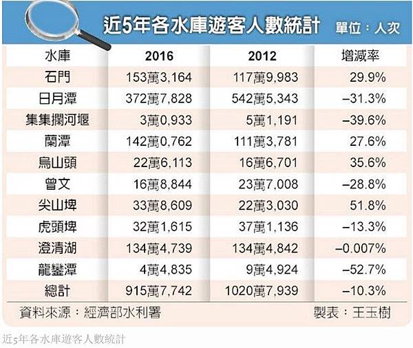 水利署2012年起正式以10座觀光水庫為主要旅遊統計對象,當年合計全台水庫總觀光人次達1002萬,之後到2014年達到1096萬人高峰,2015年還有1007萬,但去年則是首度跌破千萬,來到915萬多人次,跌幅逾一成。