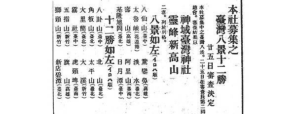 廣告文案是這樣寫的:「臺灣孤懸海外,氣候溫和,山明水秀,有美麗島之稱。此間有載於世人口碑,及見於文章繪畫者,右果足以代表臺灣名勝中之最有特色,而名下無虛歟,疑問也或者名勝中之最有特色宛若絕代佳人,居於空谷,不甚為人周知,亦茲者本社,特以臺灣全島中代表的名勝地,欲依一般投票募集。......公諸世上,並欲從大眾之輿論,識者之鑑選,擇其最優者八,付以臺灣八景名稱,廣宣傳於海內外......以純真之審美同情投票,則不勝懇望之至云爾。」
