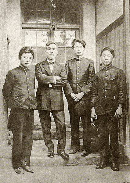 右起:王新嬰、李石樵、石川欽一郎,於石川宿舍門前