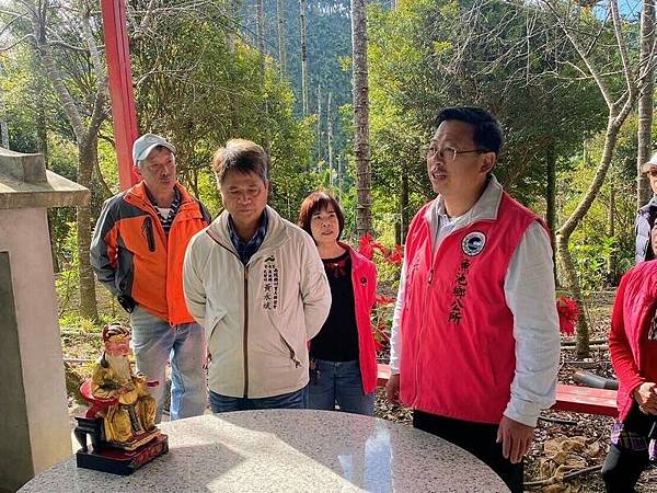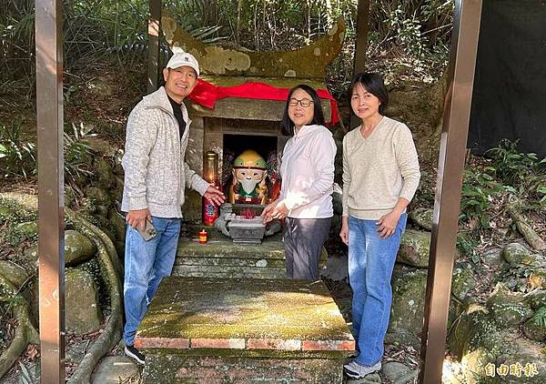 南投魚池鄉水沙漣古道有百姓公廟遭土地公「亂入」,魚池鄉長劉啟帆(右)呼籲民眾聞訊能幫忙通知請回,或有意願也可迎回供奉。(魚池鄉長劉啟帆提供)