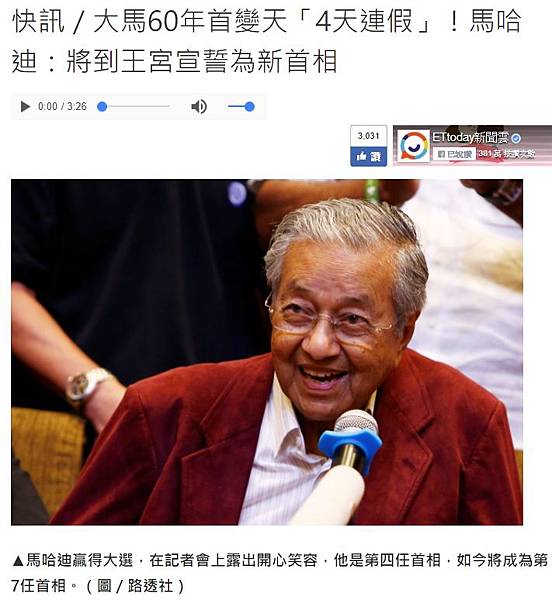 快訊/大馬60年首變天「4天連假」!馬哈迪:將到王宮宣誓為新首相 | ETtoday國際 | ETtoday新聞雲 - https://goo.gl/ARb74K