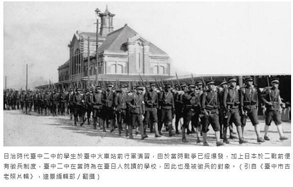 日治時代臺中二中的學生於臺中火車站前行軍演習,由於當時戰爭已經爆發,加上日本於二戰前便有徵兵制度,臺中二中在當時為在臺日人就讀的學校,因此也是被徵兵的對象。(引自《臺中市古老照片輯》,遠景編輯部/翻攝)