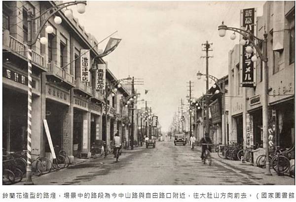 鈴蘭花造型的路燈,場景中的路段為今中山路與自由路口附近,往大肚山方向前去。(國家圖書館/提供)