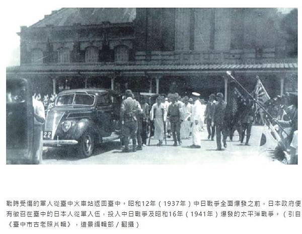 戰時受傷的軍人從臺中火車站返回臺中。昭和12年(1937年)中日戰爭全面爆發之前,日本政府便有徵召在臺中的日本人從軍入伍,投入中日戰爭及昭和16年(1941年)爆發的太平洋戰爭。(引自《臺中市古老照片輯》,遠景編輯部/翻攝)