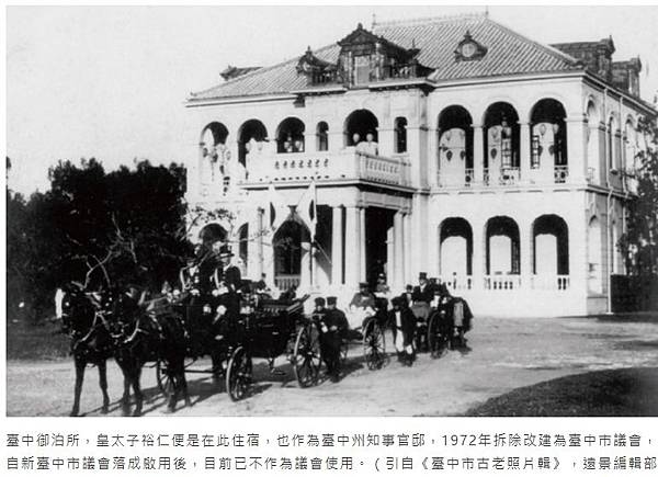 臺中御泊所,皇太子裕仁便是在此住宿,也作為臺中州知事官邸,1972年拆除改建為臺...