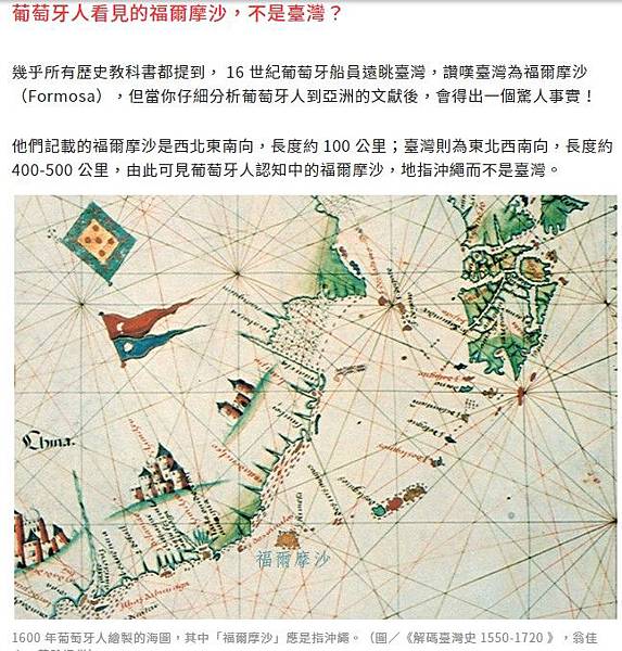 他們記載的福爾摩沙是西北東南向,長度約 100 公里;臺灣則為東北西南向,長度約 400-500 公里,由此可見葡萄牙人認知中的福爾摩沙,地指沖繩而不是臺灣。