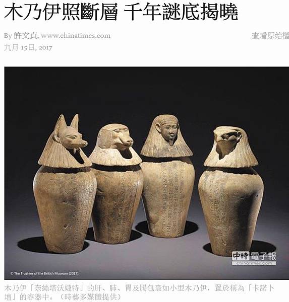 木乃伊「奈絲塔沃婕特」的肝、肺、胃及腸包裹如小型木乃伊,置於稱為「卡諾卜壇」的容器中。(時藝多媒體提供)
