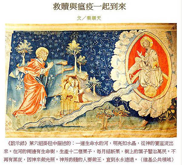 《啟示錄》第六組掛毯中描述的:一道生命水的河,明亮如水晶,從神的寶座流出來。在河的兩邊有生命樹,生產十二樣果子,每月結新果,樹上的葉子醫治萬民。不再有黑夜,因神來做光照。神所救贖的人要做王,直到永永遠遠。(維基公共領域)