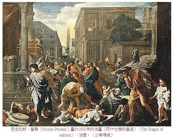 尼古拉斯.普桑Nicolas Poussin (1594~1665)1630年油畫《阿什杜德的瘟疫》(The Plague of Ashdod),法國。(維基百科)