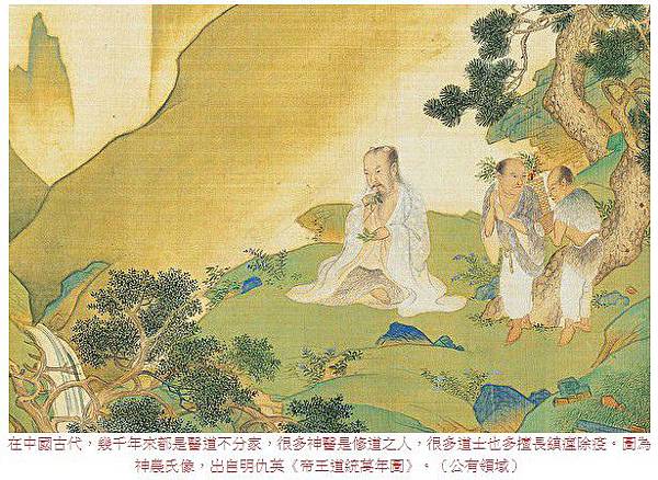 在中國古代,幾千年來都是醫道不分家,很多神醫是修道之人,很多道士也多擅長鎮瘟除疫。圖為神農氏像,出自明仇英《帝王道統萬年圖》。(公有領域)