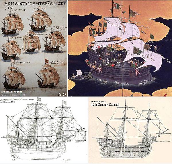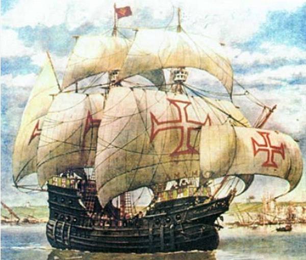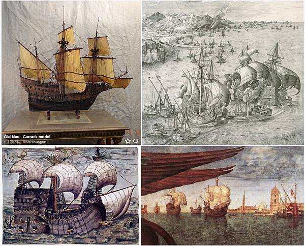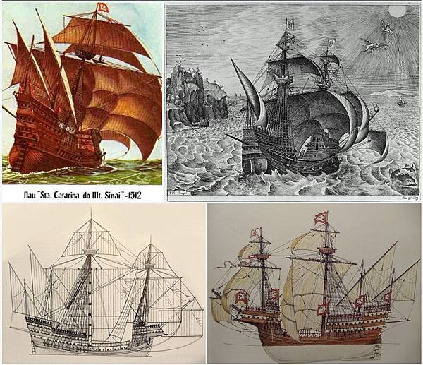到了中世紀晚期的齒輪,齒輪和類似橫帆的船隻配備了舵在船尾,沿著歐洲海岸被廣泛使用,在波羅的海,以及在地中海。鑑於地中海的條件,廚房型船隻被廣泛使用在那裡,因為是各種二維桅船,包括帆船與三角帆。這些以及類似的船型都熟悉的葡萄牙航海家和造船。由於葡萄牙人在15世紀逐步拓展探險和貿易不斷向南沿非洲的大西洋海岸,他們需要一個更大,更先進的艦對他們長期的海洋冒險。漸漸地,他們自己開發的,從他們知道在大西洋和地中海的操作船型方面的融合和改造海洋carracks型號,總結他們在世紀大洋間旅行用新的最終用途,更帆索具的高級形式,允許在大西洋的強風和海浪大大改善航行性能。除了平均噸位Naus談,一些大型Naus談(carracks)也都建在統治葡萄牙的約翰二世,但均在世紀之交後,只有普遍。葡萄牙carracks通常是非常大的船他們的時間(通常超過1000噸),以及具有未來大Naus談印度運行以及中國和日本的貿易,還有其他新型設計的。