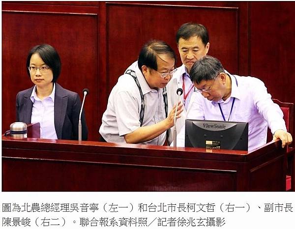 圖為北農總經理吳音寧(左一)和台北市長柯文哲(右一)、副市長陳景峻(右二)。聯合報系資料照/記者徐兆玄攝影