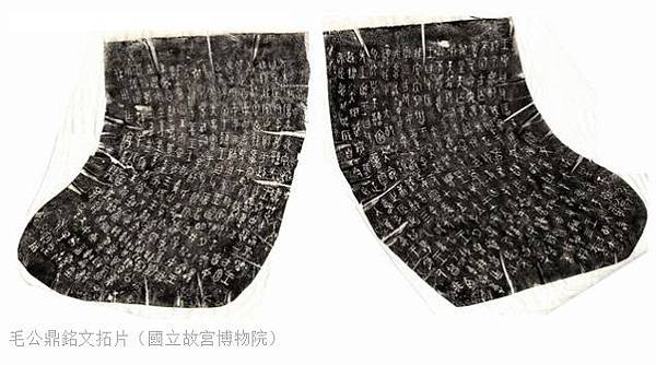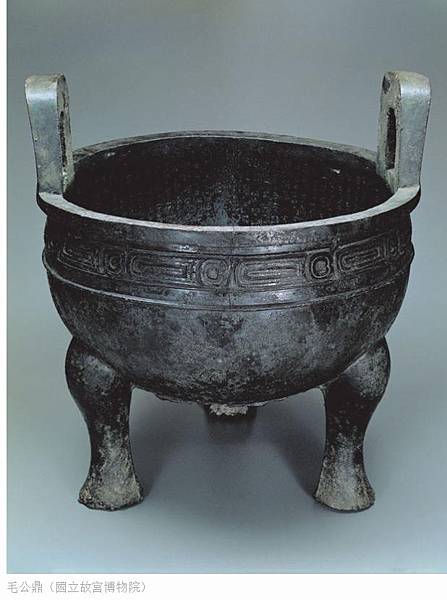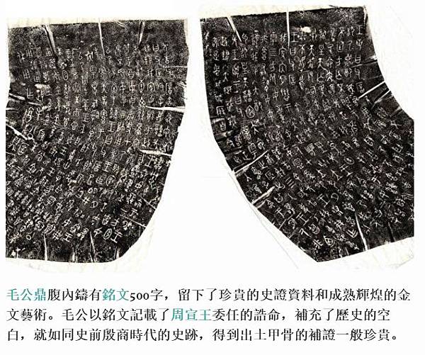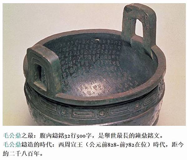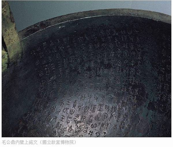 毛公鼎是中國二千八百多年前的一件宗廟祭器。它的內壁鑄有五百個字的長銘,是現存商周兩代七千多件有銘文的銅器中,銘文最長的一件。銘文的內容可分成七段,大意是說:周宣王即位之初,亟思振興朝政,乃請叔父毛公為其治理國家內外的大小政務,並飭勤公無私,又令毛公族人擔任禁衛軍,保護王室,最後頒贈厚賜,毛公因而鑄鼎傳示子孫永寶。由內容推測,毛公鼎應鑄於周宣王元年(西元前827年)時,其銘文是可凌駕於〔尚書〕的一篇西周真實史料,是研究西周史最珍貴的文獻,也因此毛公鼎可稱是舉世的瑰寶重器。