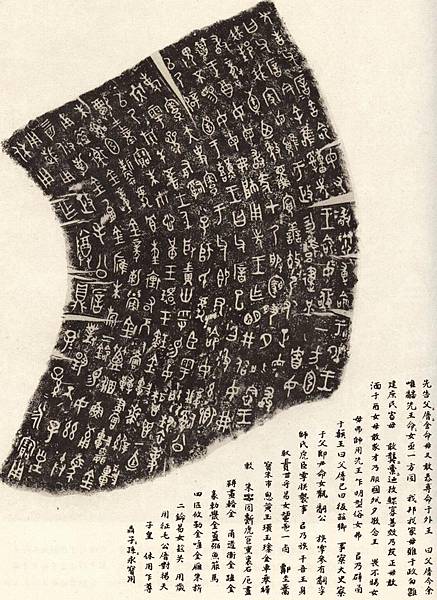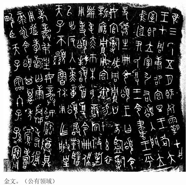 青銅器上鑄刻的文字稱為「金文」,是廣義的大篆書體的一種。另外,很多銘文是鑄在鐘、鼎上,所以青銅器銘文也稱「鐘鼎文」。