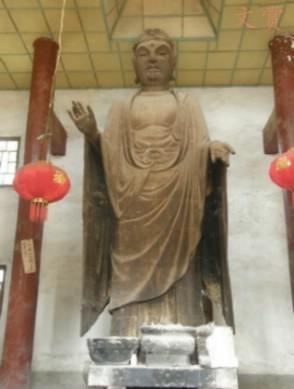 史料記載此佛為一尊旃檀佛。鐵佛造像是座像為一體。座分兩層,下層高8cm,為八角形,每面長84cm。上層高37cm,周邊鑄仰蓮瓣32枚,分內、外兩層圍成圓形,託於八角底台上。像高5.32米,身著袈裟,袒胸跣足,面部豐滿,唇微啟,端莊、肅穆,右手上舉做“無畏印”,左手舉至胸側,稍高於肘,做“與願印”,屹立於蓮台上,風采奕奕、栩栩如生。“大定二十一年(1181年)二月二十日,同年五月樹像竣工”、“施主富平縣令楊思聰、武盛將軍李富、李宜人……”等字樣。這尊造像敦厚。純樸,塑鑄的活靈活現、惟妙惟肖、繪形繪色、巧奪天工,對研究我國金代冶鑄技巧、雕塑藝術及社會風俗習慣提供了可靠的實物依據。