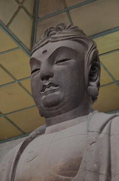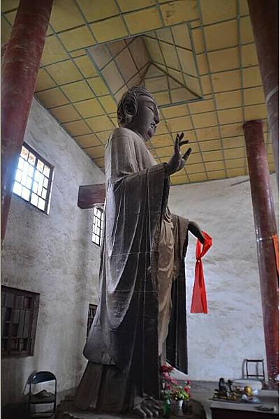 秉燭細看,只見造像的袈裟前左皺摺下和座上有三處陽文銘文:「大定二十一年(1181年)二月二十日,同年五月樹像竣工」、「施主富平縣令楊思聰、武盛將軍李富、李宜人……」等字樣。環顧四周,皆鐵冶制,敲其身,未有空空聲,乃實體也。問老人像高几許,不知何時有三位孩童立於殿外,他們爭搶答曰:「5米32」,我暗自驚嘆,連幼童皆熟知佛之高偉,真乃神也。聽老人言,此三童時常翻入院內玩耍,而此時面對佛之聖像,三人皆溫順而立,一者說:「佛的右手向外推人,左手向內收人」。我借光細觀,只見佛之右手確實外推,左手亦做內收之勢,兩手自然伸出,掌中細細紋絡清晰可見。