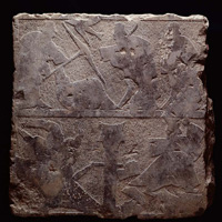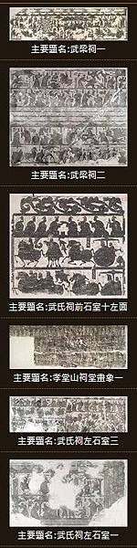 內容說明 第一層山牆銳頂部分:中間為西王母,有翼,座兩側有二龍首,左右兩旁各有二翼侍女侍奉,(俱一人在上,一人在下,其中右邊下方羽人做跪拜狀)。右側由右至左分別為一鳥、蟾蜍,及玉兔搗藥;左側由右至左分別為,應龍、二羽人,人首鳥身; 第二層為帝王十人:由右至左分別為,1、女媧伏羲,榜題:「伏戲倉精,初造〔王〕業,畫卦結繩,以理海內」;2、祝融,榜題:「祝誦氏無所〔造〕為,未有耆欲,刑罰未施」;3、神農,榜題:「神農氏因宜〔教〕田,辟土種穀,以振萬民」;黃帝,榜題:「黃帝多所改作,造兵井田,〔制衣〕裳,立宮宅」;顓頊,榜題:「帝顓頊高陽者,黃帝之孫,而昌□□(意之)子」;帝佶,榜題:「帝高辛者,黃帝之曾孫也」;帝堯,榜題:「帝堯放勳,其仁如天,其知如神,就之如日,望之如雲」;帝舜,榜題:「帝舜名重華,耕於歷山,外養三年」;夏禹,榜題:「夏禹長於地理,脈泉知陰,隨時設防,退為肉刑」;夏桀,畫像為一戴冠者荷戟,坐於兩婦人背上,榜題:「夏桀」; 第三層由右至左分別為:1、曾母投杼:右邊一婦人(曾母)坐織布機上右向,作訓示狀;織布機後,有一杼墜地;曾母下有一榜題「讒言三至,慈母投杼」。左邊有一人戴冠拱手右向婦人下跪(曾參),曾參上方有一榜題:「曾子質孝,以通神明,貫〔感〕神祗,箸號來方,後世凱式,以正「木無」綱」。 2、閔子騫失棰:圖像為一右向馬車(軺車),車上坐有一長者(子騫父)及小孩(子騫後母弟),長者左顧伸手拉住車後方戴冠者(閔子騫),馬匹上方有一榜題為「子騫後母弟,子騫父」。車後方戴冠者(閔子騫)拱手跪於地上,上方有一榜題為「閔子騫與假母居,愛有偏移,子騫衣寒,御〔車〕失棰」。 3、老萊子娛親:右邊一人左向臥地,兩手舉舞(老萊子);中間有一婦人執便面左向(萊子妻),上方有一榜題為「老萊子,楚人〔也〕,事親至孝,衣服斑連,嬰兒之態,令親有驩,君子嘉之,孝莫大焉」;左側有一老者及一老婦坐於榻上,榻上有垂帷幔,榻下有一榜題為:「萊子母」、「萊子父」。 4、丁蘭立木為父:右側有二人,一人戴冠拱手作跪拜狀(丁蘭),右上一婦人左向跪拜,下有一犬蹲著;左邊有木像;上方有一榜題為:「丁蘭二親終歿,立木為父,鄰人假物,〔報〕乃借與」; 第四層由右至左分別為:1、曹子劫桓:右側一戴冠者執笏左向(管仲),榜題「管仲」。中間有二人,右邊一戴冠者左向,跽坐於榻上(齊桓公),榜題「齊桓公」,左邊一戴冠者(曹沫)右向立,手持匕首向桓公作劫刺狀,榜題「曹子」。左側一戴冠者(魯莊公)右向立,作伸手狀,榜題「魯莊公」; 2、專諸刺吳王:右側有二人(二侍郎)執長戟夾持中間跪者,中間跪者,雙手捧魚進獻(專諸),榜題:「二侍郎,專諸炙魚,刺殺吳王」。右側,一戴冠者(吳王)執劍右向,跽坐於榻上,前置一案,榜題:「吳王」,吳王與專諸之間,上方有一飛鳥; 3、荊軻刺秦王:右側有二人,一人散髮,雙手上舉(荊軻),榜題:「荊軻」。另一人雙手抱著其腰部。中間上方有一人驚恐臥地左向(秦武陽),榜題:「秦武陽」,下方有一盒,內有一首級,榜題:「樊於其頭」。左側右邊有柱子,柱上有一匕首,柱子左邊有一人(秦王),右顧作驚恐狀,榜題:「秦王」; 第五層車馬出行由左至右:左側有兩前導執戟騎吏,一左向馬車(軿車)。間中間兩從騎,一左向馬車(卷棚車);右側為二從騎,及一執刀和便面的步卒。