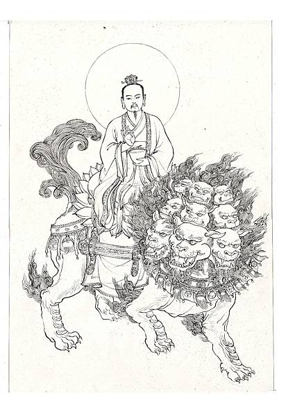 接著元始天尊又化現帝王相,騎著一隻九頭獅子,手拿著如意,腳踩著蓮花,化出大成就的光芒,升空而去。