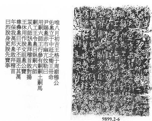 唯八月初吉丁亥,王各于周庙,穆公佑盠,立于中廷,北向,王(呼)册命尹,赐盠:赤韨、幽衡、鋚勒,曰:用司六师王行,叁有司:司土、司马、司工,王命盠曰:□司六师暨八师艺。