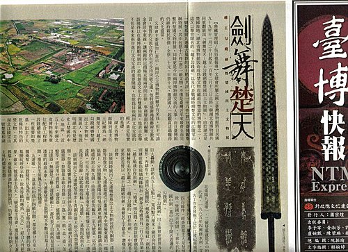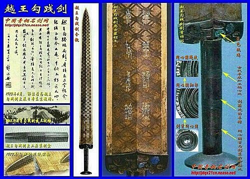 1965年12月,中國考古人員在湖北省江陵縣望山(距春秋時代的楚國別都紀南城故址約五公里處)的1號楚墓中,於墓主的遺骸左側,發現一個黑漆木的劍鞘,內有一把長劍,拔劍一見,現場人士無不驚訝於此劍雖已深埋地底約2400年,卻不見私毫鏽蝕痕跡。劍身上明顯可見「戉王鳩淺」及「自乍用鐱」兩行八個字的鳥篆銘文,請教於考古學家兼古文字學家的郭沫若,經其研究後,譯出其意為「越王勾踐,自作用劍」,原來這就是春秋時期,以「臥薪嚐膽」聞名於世的越國之君勾踐(同句踐;生前不詳‧西元前496~464年在位)的劍。