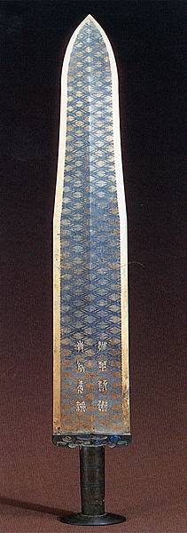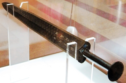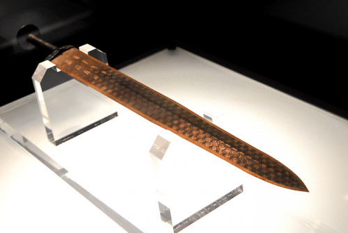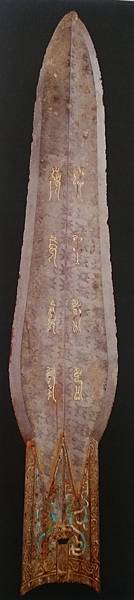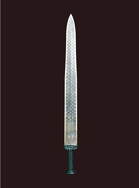 考古工作者在湖北江陵望山的戰國墓中發現一柄青銅劍,這把長55.6公分、寬5公分的劍浮現精美的流線形,擦去浮塵後,劍身通體裝潢的黑色菱形花紋像星光一樣閃耀,劍格以綠松石和極珍稀的藍琉璃,鑲嵌出雲紋和獸面紋,劍柄處刻著8個鳥篆體銘文"越王勾踐自作用劍"。